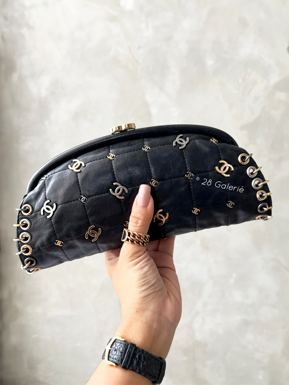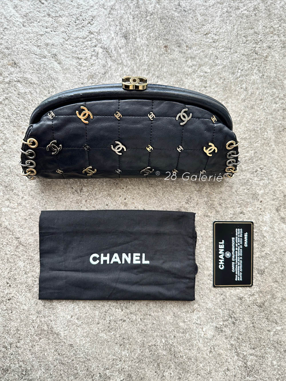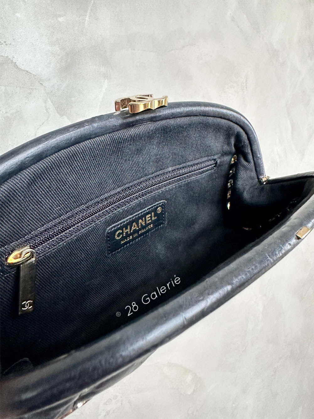 This is a rare Chanel clutch from the house’s 2007 Spring Resort Collection and popularized by Penelope Cruz and Victoria Beckam. It is in excellent pre-owned condition with usual signs of wear such as faint hairline scratches around the exterior lambskin leather as well as on the hardware. It has raised leather indentations near the turnlock.