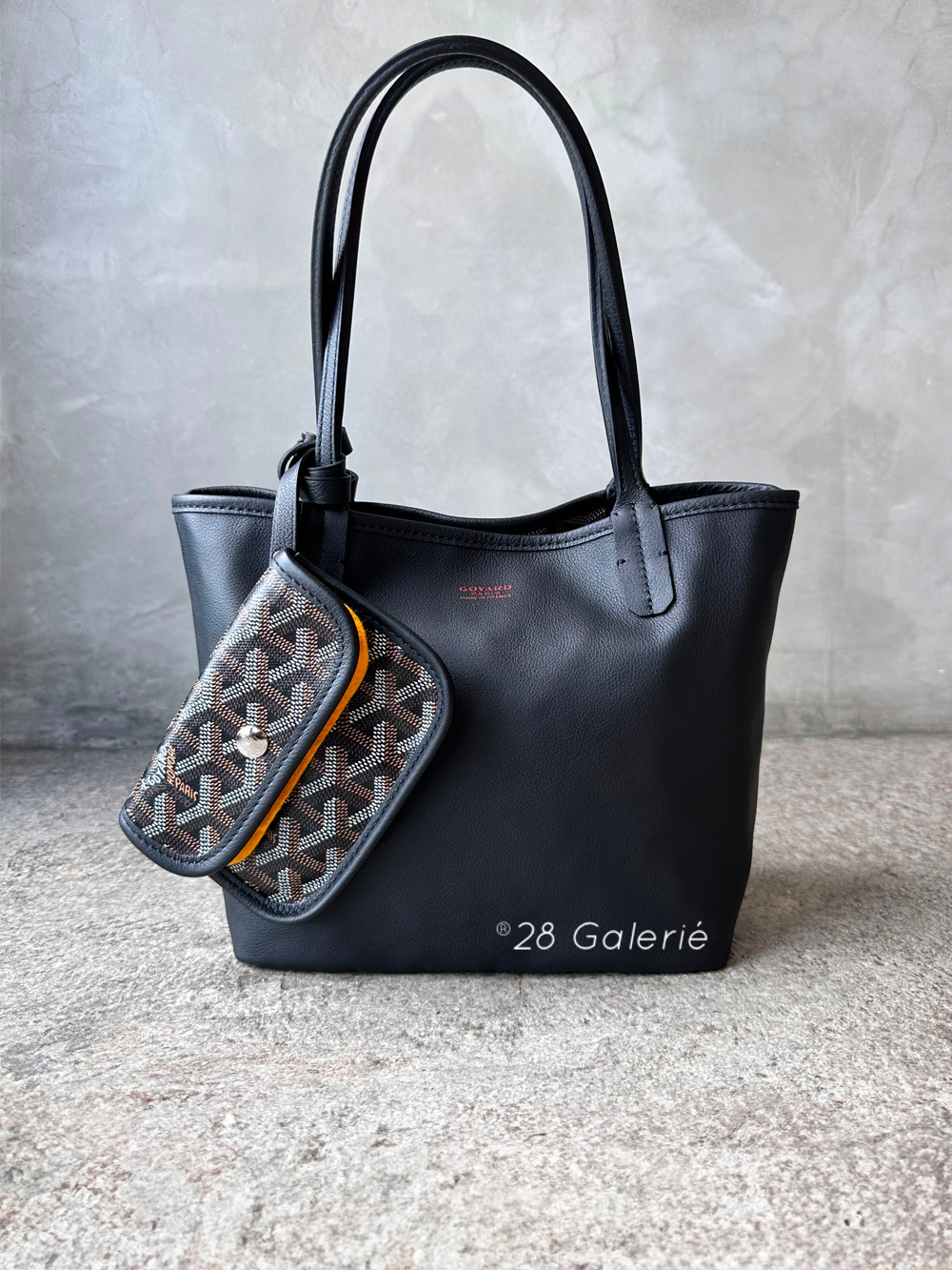 This is a pristine tote with 2 miniscule but unnoticeable pen marks on the exterior black leather.