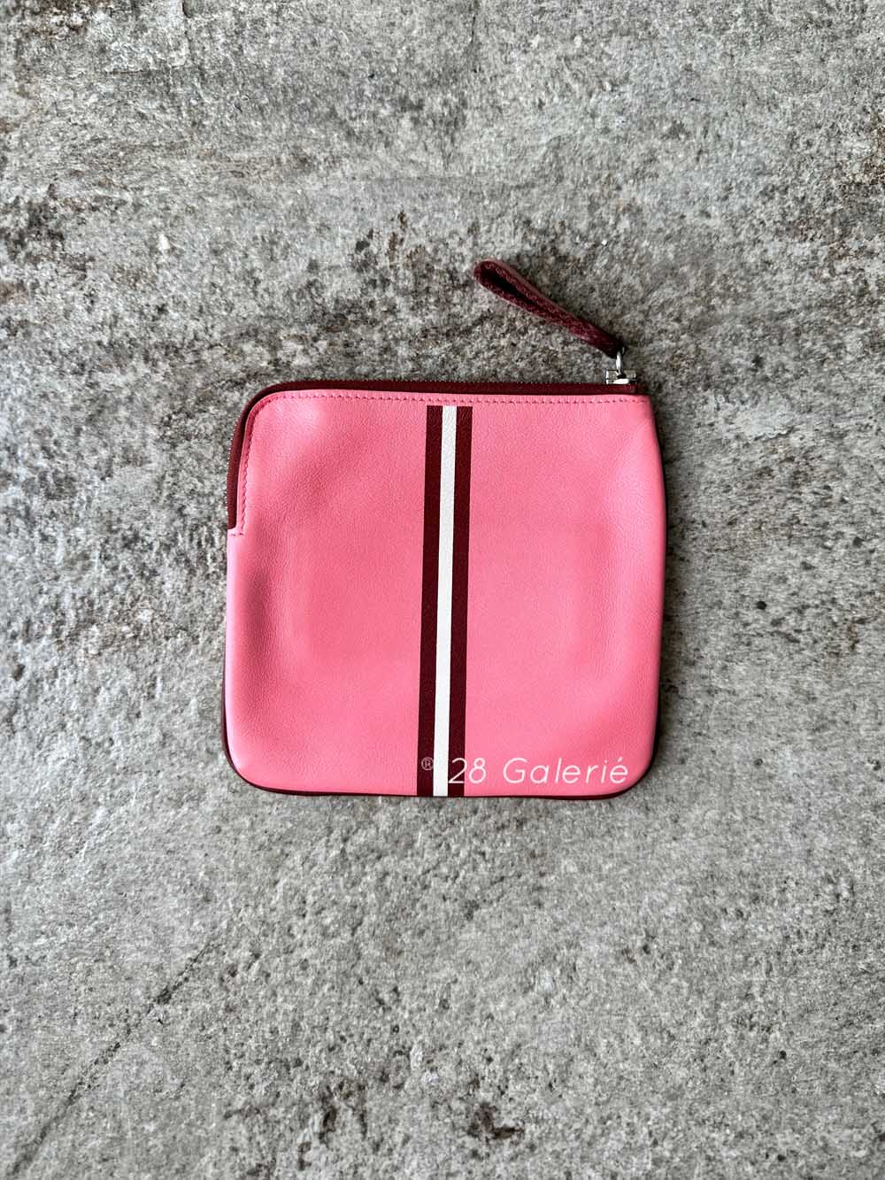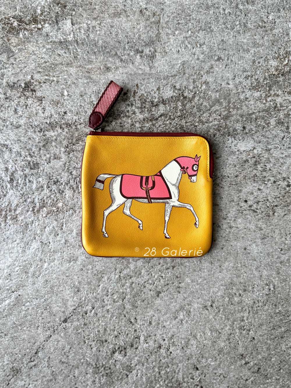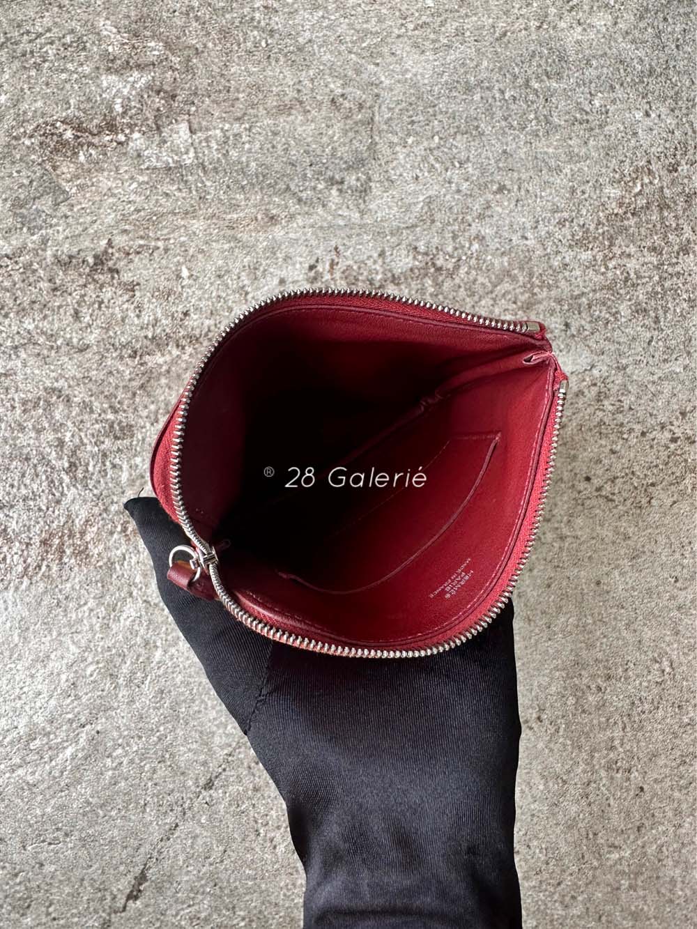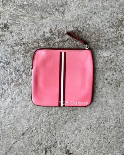 This cute pouch is in pristine condition. The top comes with a zip closure and a short leather strap. It has one main compartment in the interior and one card slot. It can be used as a bag insert to hold your small essentials or put together with more pouches using a lanyard.